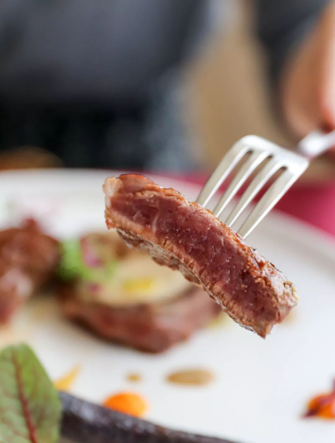 我点了5分熟,切开是迷人的小桃红,雪花和油脂分布均匀,入口会有轻盈的牛肉汁水。